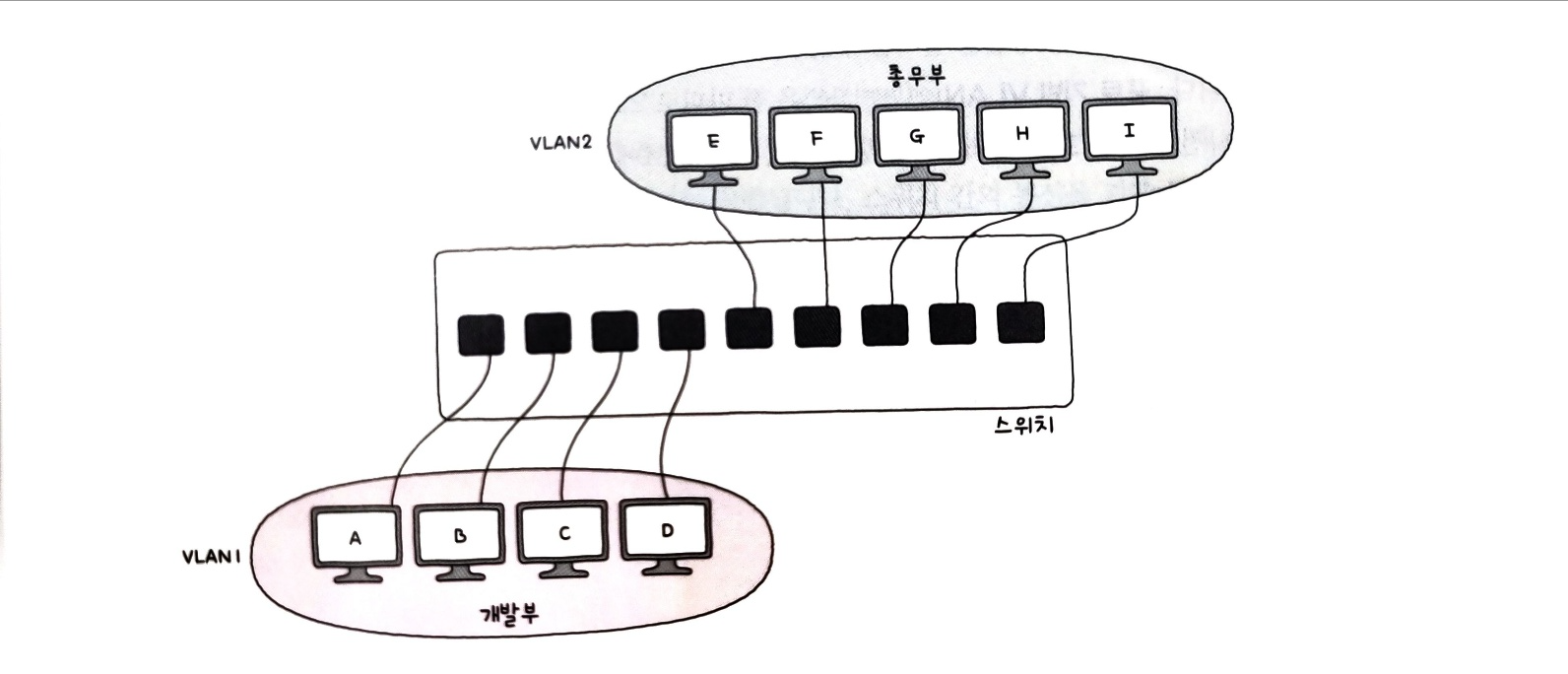 VLAN1에 속한 호스트 A,B,C,D는 서로 동일한 LAN에 있는 것으로 인식하지만, 다른 VLAN에 속한 호스트 E,F,G,H,I는 물리적인 거리와 관계없이 다른 LAN에 있는 것처럼 인식한다.