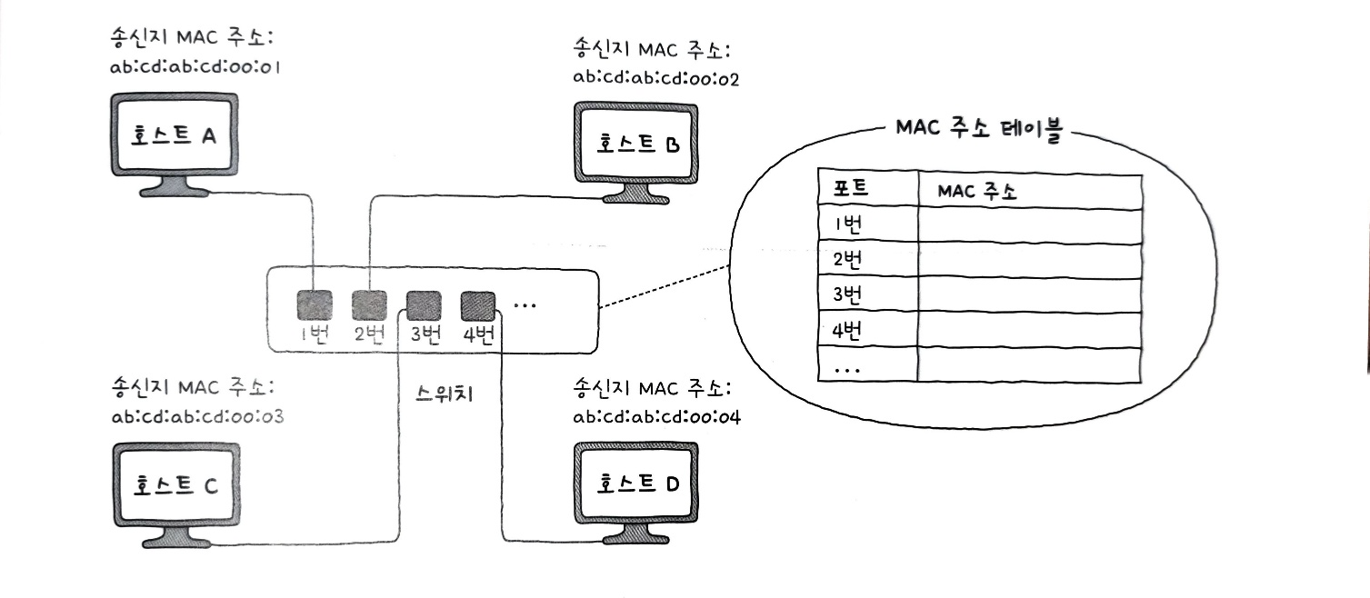 스위치는 포트와 연결된 호스트의 MAC 주소 연관 관계를 나타내는 정보를 MAC 주소 테이블이라고 부른다.