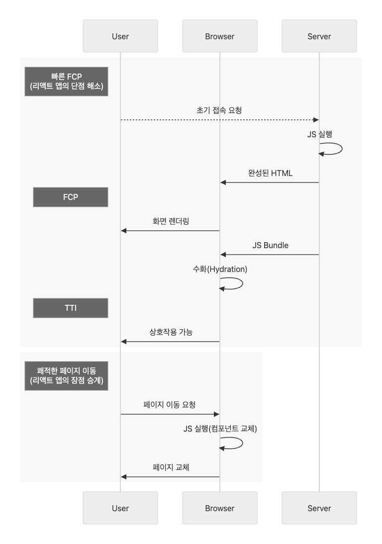 Next.js의 사전 렌더링 기능은 CSR의 문제점이었던 느린 FCP를 해결하면서도 장점인 빠른 페이지 이동은 계승한다.