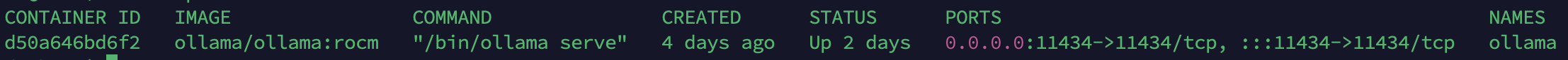 docker run -d --device /dev/kfd --device /dev/dri -v ollama:/root/.ollama -p 11434:11434 --name ollama ollama/ollama:rocm