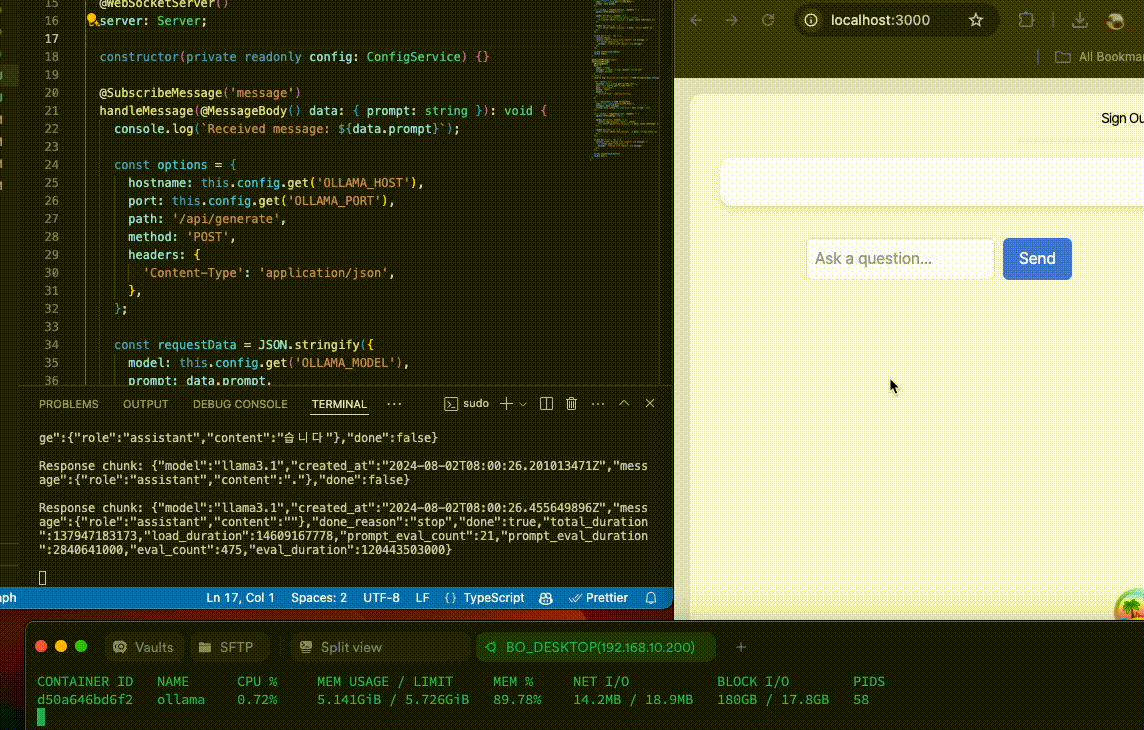 NestJS를 사용하여 웹 소켓 서버를 구현한다. 서버는 클라이언트의 요청을 받아 Ollama 서버로 전달하고, 결과를 다시 클라이언트에 전송한다. 여기서는 Langchain 패키지를 사용하지 않고, 직접 구축한 서버의 endpoint를 통해 REST API 요청으로 처리하였다.