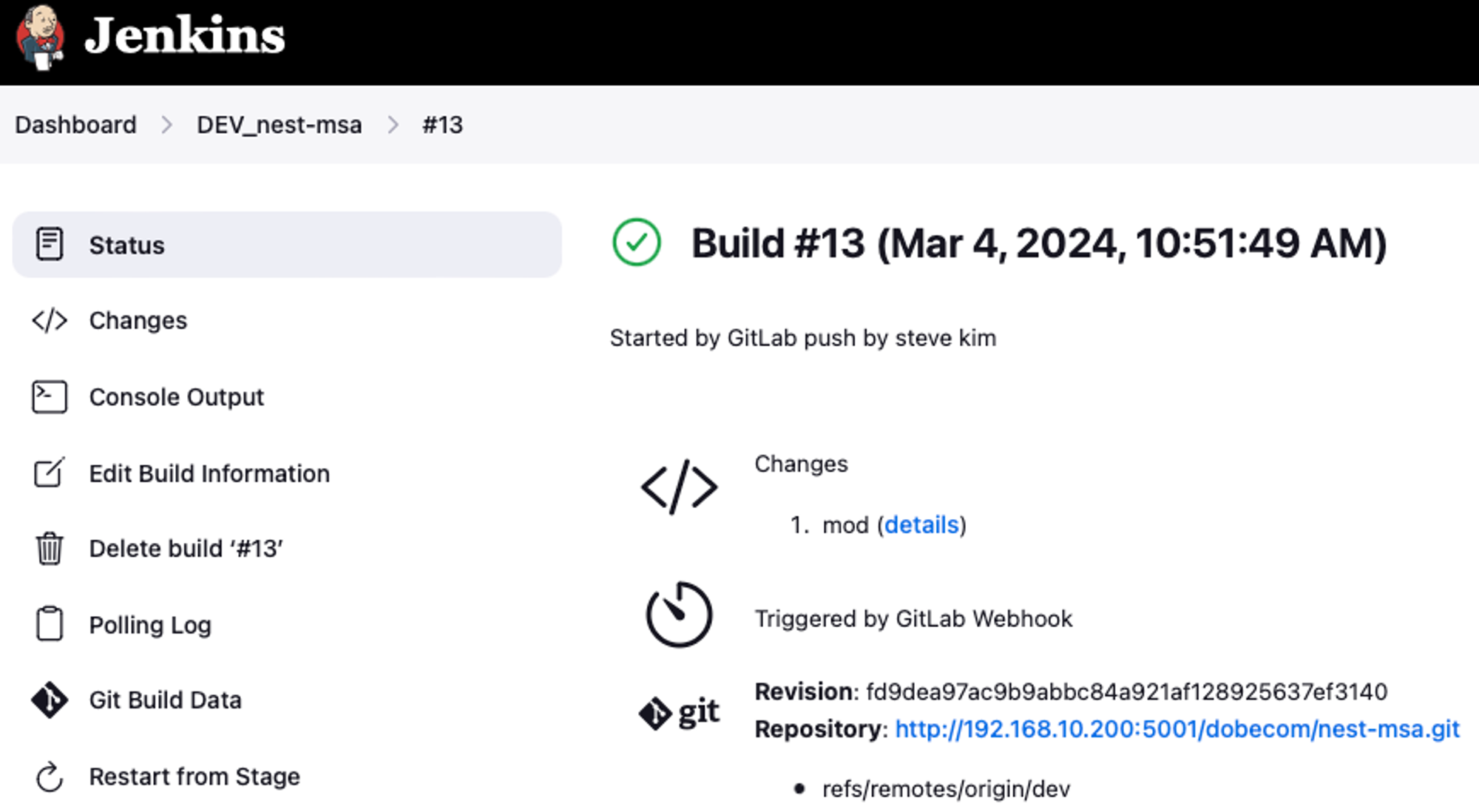 sudo cp ../config/nest-msa/Dockerfile.init .sudo docker build -f Dockerfile.init -t 192.168.10.200:5000/nest-msa:dev .API Repository 배포 테스트