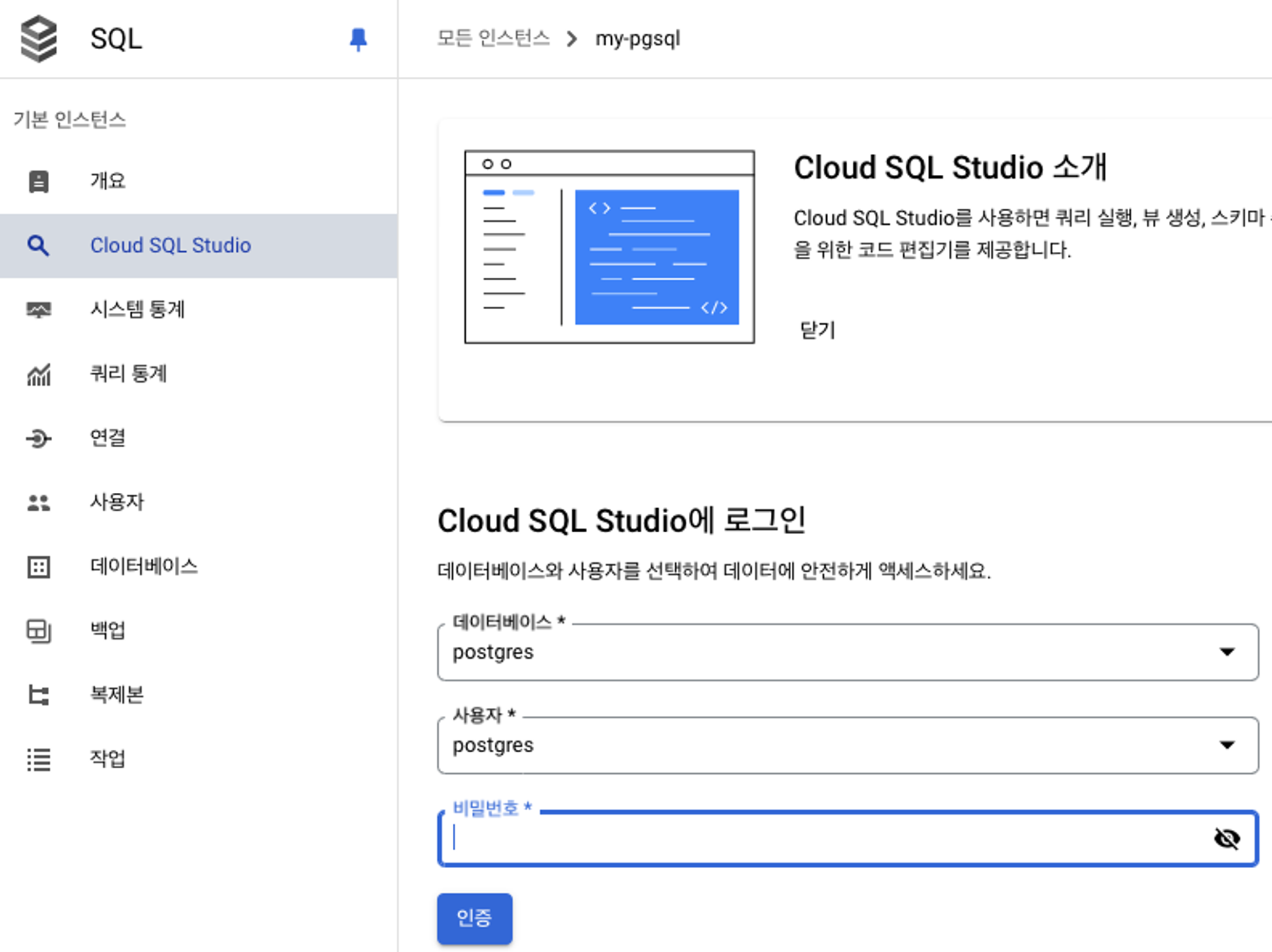 - 생성 완료 후, Cloud SQL Studio를 통해 범용 DB 툴에서 사용하는 것처럼 schema/table 생성 가능