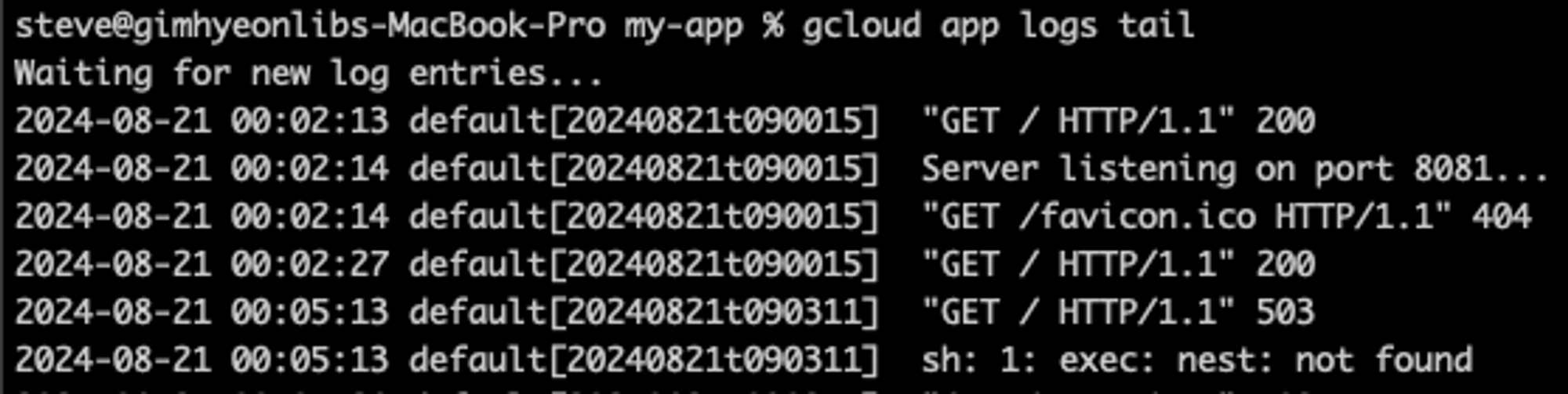 - gcloud 배포를 진행하면 아래와 같은 에러(nest not found)가 발생한다