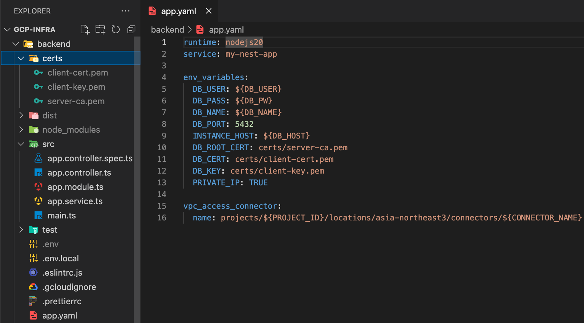 2. Backend 서버의 루트 디렉토리에 certs 폴더를 생성하고 인증서를 카피한 후, app.yaml에 아래와 같이 작성
