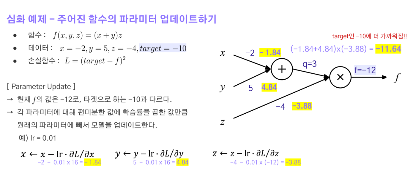 epoch: 전체 데이터셋을 한 번 모두 학습하는 횟수. 예를 들어, 1000개의 트레이닝 데이터를 10번 학습하면(epoch=10), 총 10000개의 데이터를 보게 된다.iteration: 모델의 파라미터를 업데이트하는 횟수. batch 사이즈 만큼의 데이터를 학습할 때마다 한 번 parameter를 update한다. 예를 들어, 1000개의 데이터를 배치 사이즈 100으로 학습하면, 1 epoch에 10번의 iteration이 발생한여 1번 학습(1 epoch) 하는데 10번 파라미터가 업데이트 된다. step: parameter 한 번의 업데이트를 의미.batch: 파라미터 업데이트에 사용되는 데이터의 수. iteration수 배치 사이즈가 1인 경우는 온라인 학습(online learning)이라고 한다.Backpropagation은 gradient descent를 딥러닝 모델에 적용하기 위한 방법이다. Layer가 굉장히 많은 딥러닝모델에서 각각의 가중치를 업데이트 하기 위해서는 Loss를 각각의 파라미터로 편미분 해야하는데 이를 연쇄법칙을 이용하여 다음 노드의 편미분계수를 사용해서 지금 노드의 편미분계수를 얻어 가중치를 업데이트 하는 방식이다.