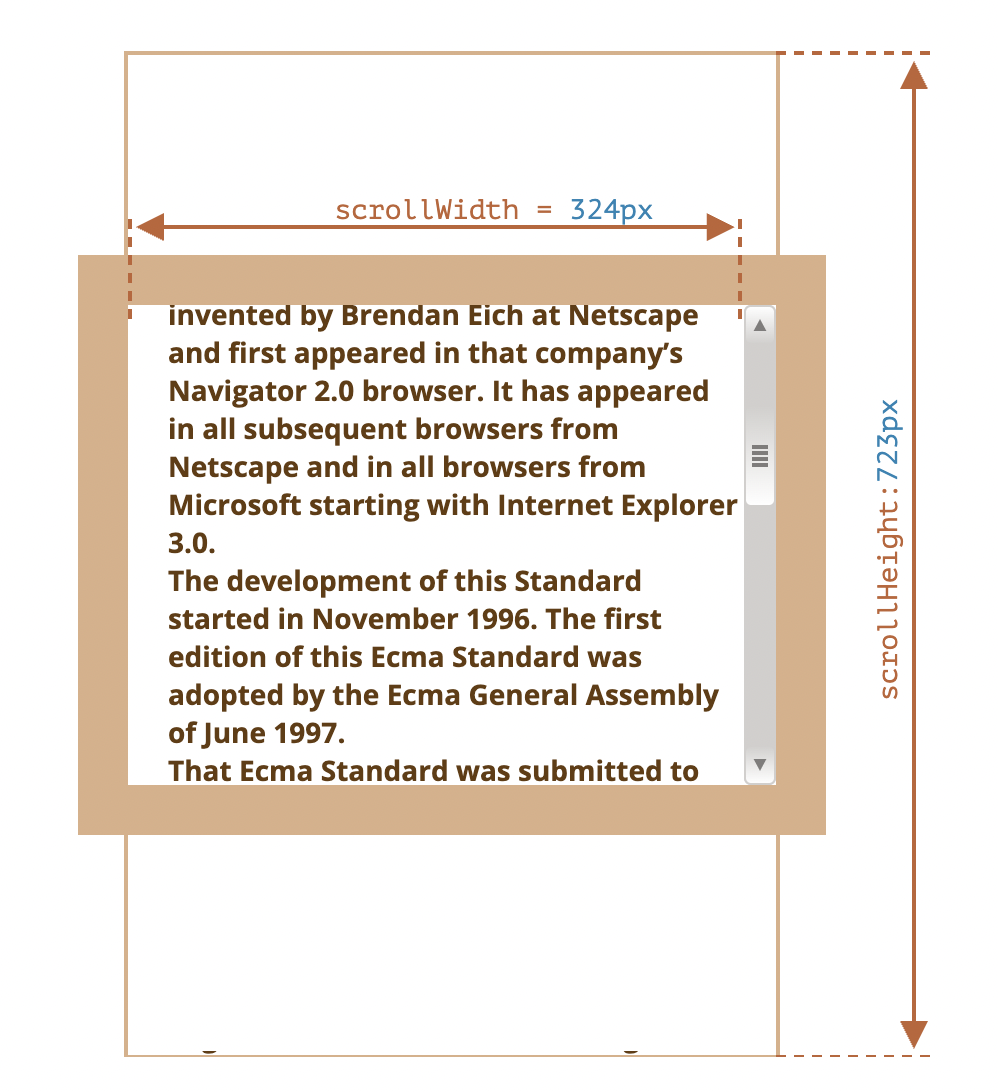 scrollWidth/Height 프로퍼티는 client와 유사하지만 스크롤바에 의해 감춰진 영역도 포함합니다.