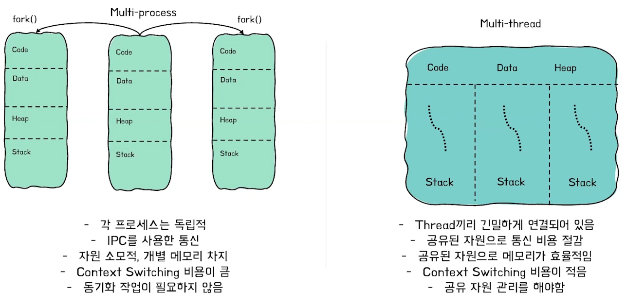- 멀티 프로세스는 독립적인 메모리를 가지고 있지만 멀티 스레드는 자원을 공유 - 각각의 장단점이 존재