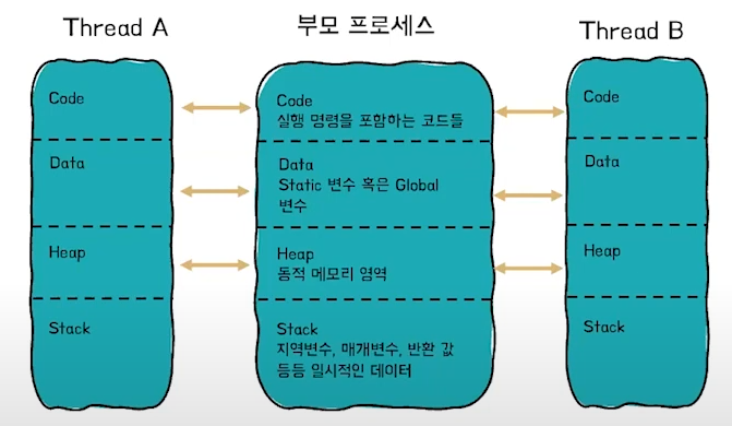스레드는 코드, 데이터, 힙 영역을 공통된 자원으로 사용, 스택 부분만 따로 가지고 있음