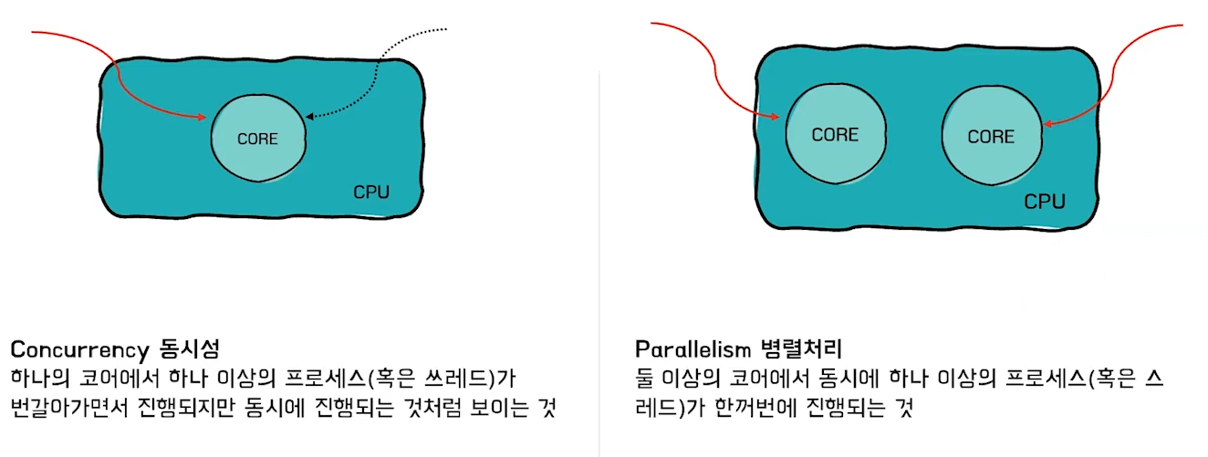 - 병렬 처리: 물리적으로 여러 코어를 사용해서 다수의 실행 단위를 한순간에 처리할 수 있음