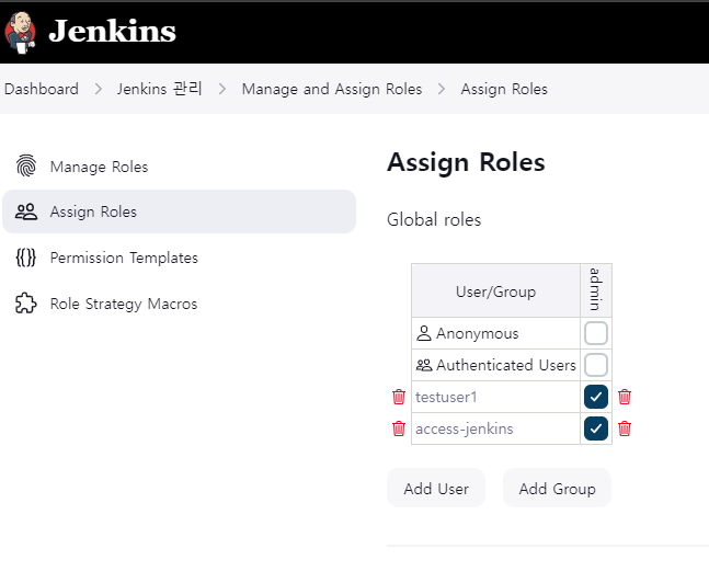 - [ Add Group ] > access-jenkins 생성 후 admin 권한 부여