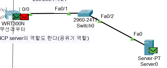 사진에는 표시가 안됐지만 pc0과 pc1은 무선라우터 WRT300N과 무선연결되어 있다.