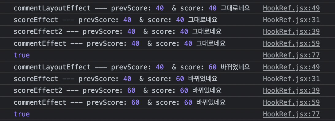 아래 5줄 중 첫째 줄 => comment가 deps인 LayoutEffect를 시행할 때까지는, 즉 DOM이 그려지기 이전 시점까지는 prevScore.current는 40으로 유지된다. 그래서 이 시점의 comment는 '바뀌었네요'이다.