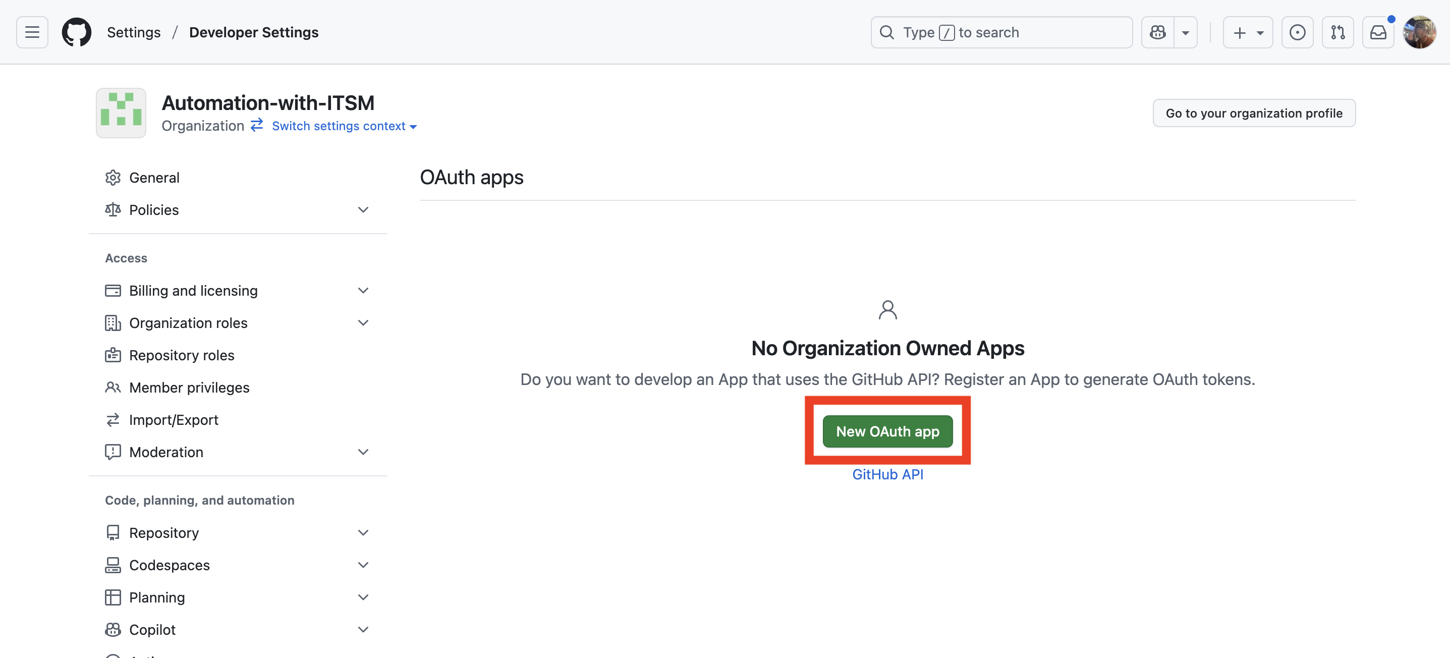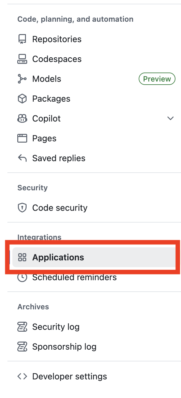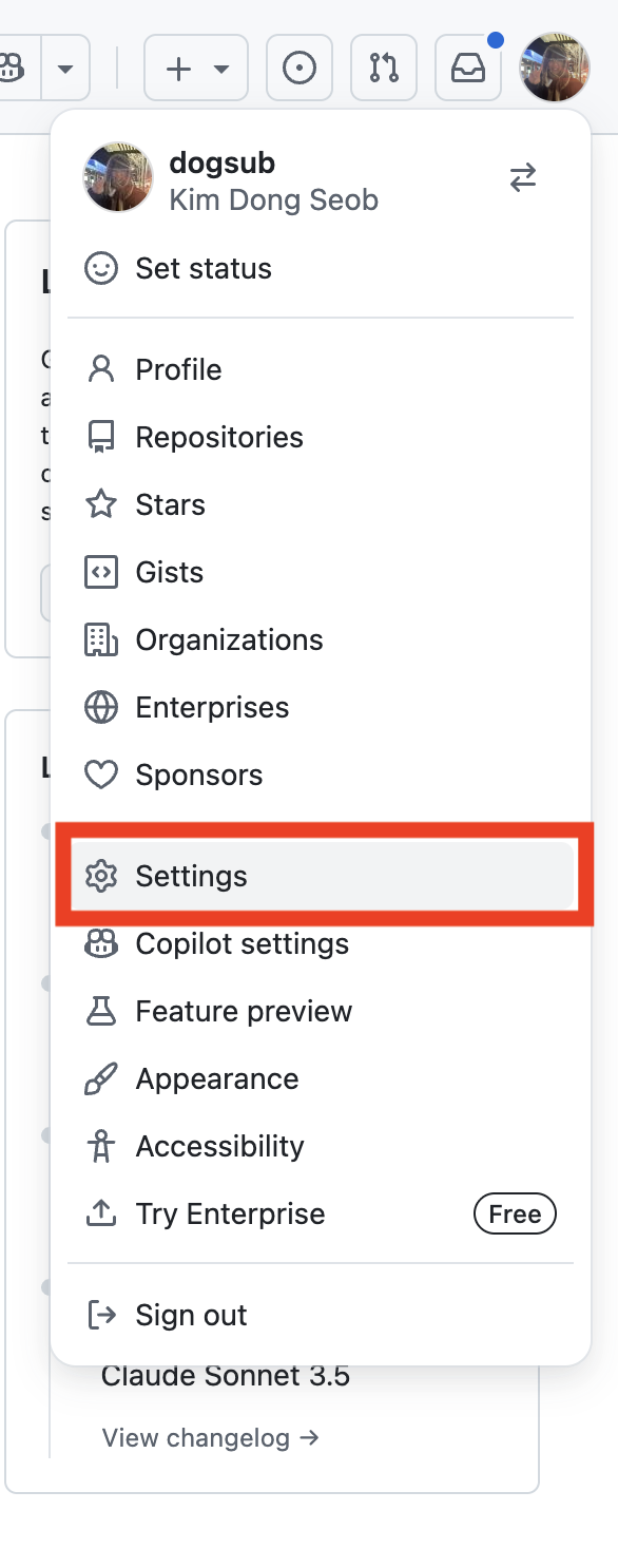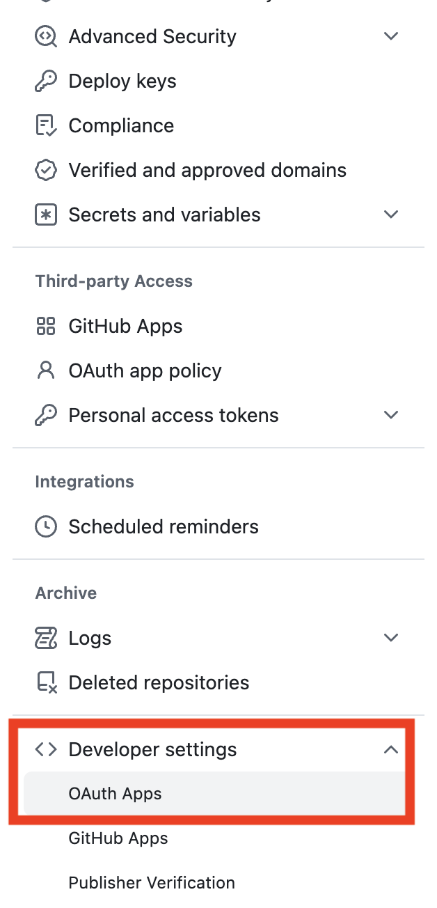 "Settings" -> 좌측 사이드바 최하단 "Developer settings" -> "OAuth Apps" -> "New OAuth app" 클릭