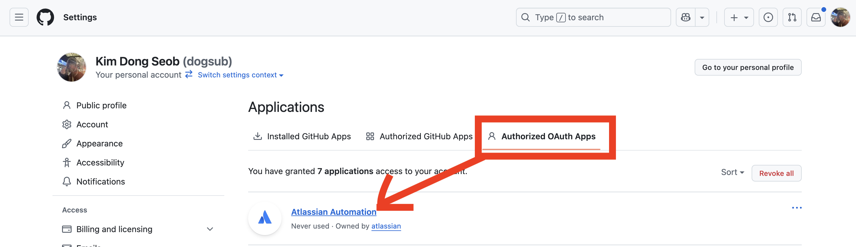 사용자 프로필 클릭 -> "Settings" -> "Applications" -> "Authorized OAuth Apps" -> "Atlassian Automation" 클릭 -> 자동화를 구축할 Organization "Request" 혹은 "Grant" 클릭