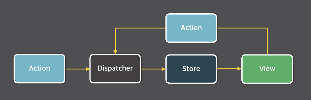 모든 상태 변화는 Store를 통해 일어나며 Dispatcher 단계를 거쳐야지만 상태값 변경 요처이 가능하다.