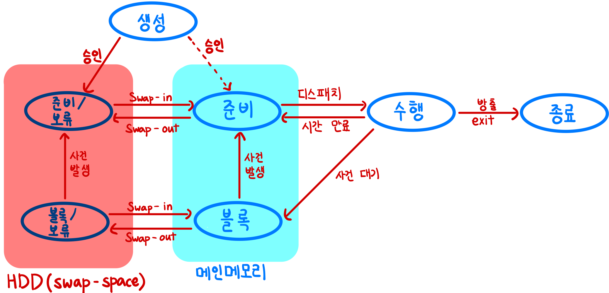 - 5-상태 프로세스 모델에서 메모리 공간이 부족할 수 있기 때문에 HDD(swap-space)를 추가하여 7-상태 프로세스 모델을 만들었다.