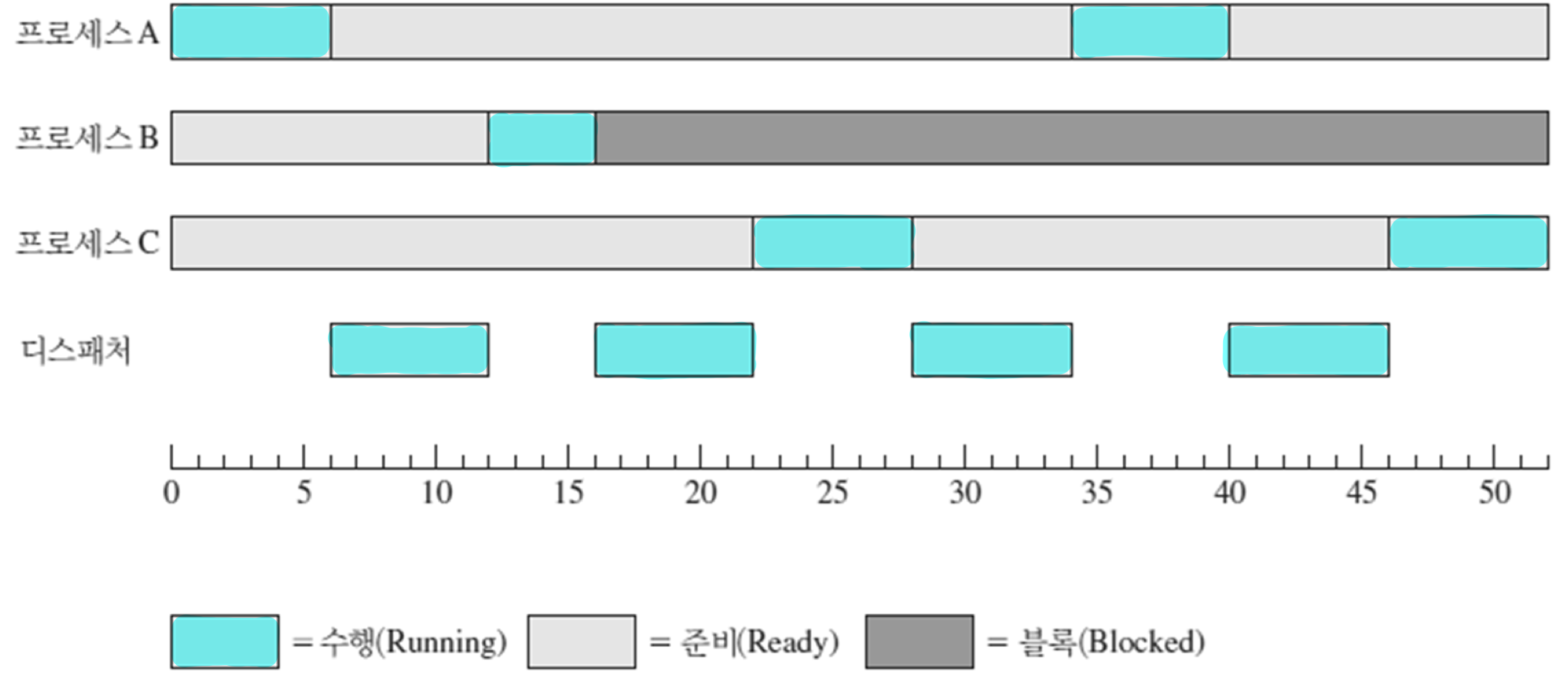 - 디스패처는 수행이 끝나거나 블록 상태인 프로세스를 준비 상태인 다른 프로세스에 처리기(CPU)를 옮기는 작업을 수행한다.