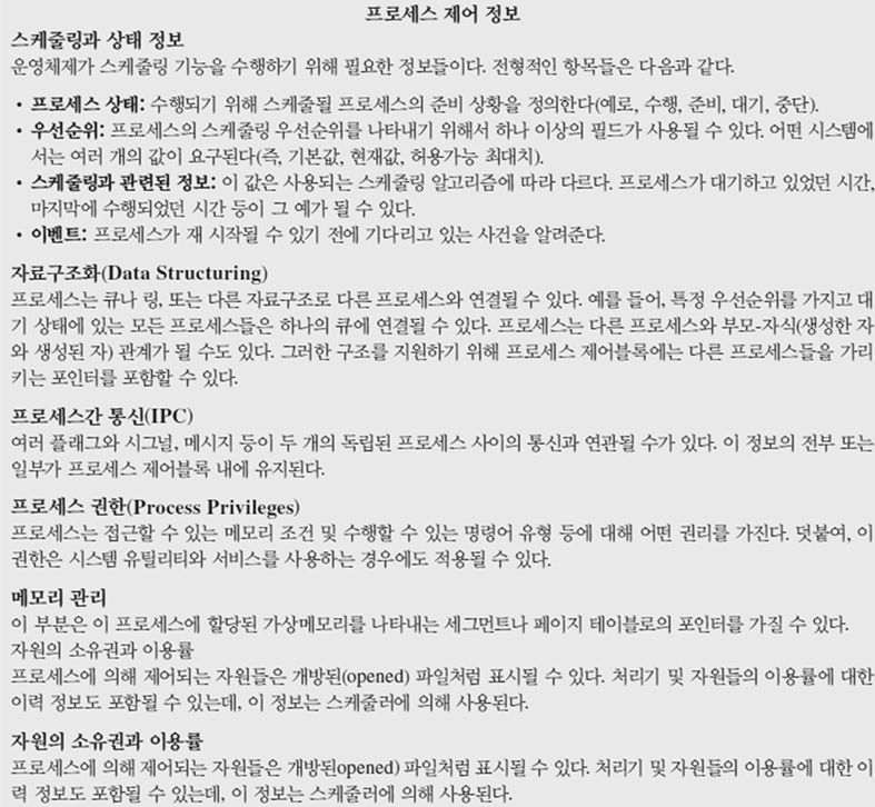 프로세스 제어 블록(PCB): 각 프로세스의 정보를 저장하는 데이터 구조이다. 각 프로세스는 고유한 PCB를 가지며, 이를 통해 프로세스 상태, 메모리 사용, 스케줄링 정보 등이 관리된다.