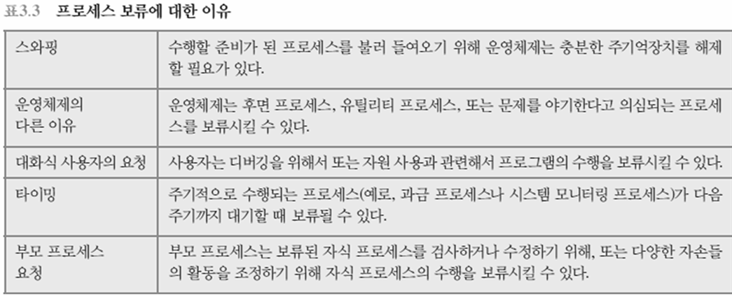 - 보류(suspending) : 준비(ready)상태나 블록(blocked)상태에서 메모리 공간이 부족할 때나 다른 경우에 스와핑(swapping)(정확히는 swap-out)을 통해 보류(suspending)상태가 된다.