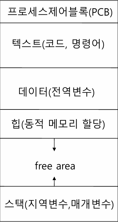 - 프로세스는 운영체제 1장에서 다뤘듯이 코드영역, 데이터영역, 힙영역, 스택 영역으로 구성되어있다. 추가로 가장 위에는 밑의 내용에서 다룰프로세스 제어블록(PCB)이 있다.