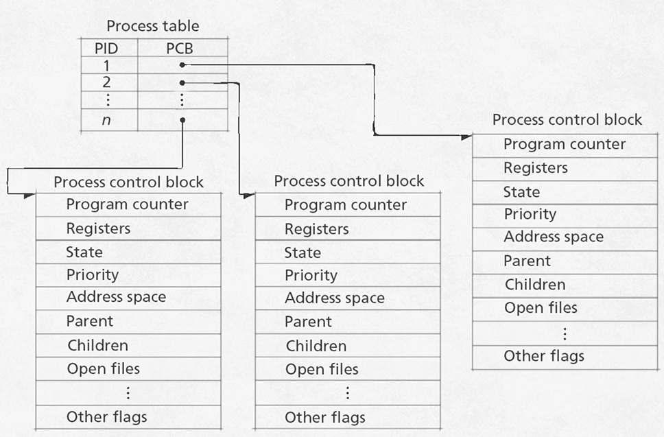 운영체제는 시스템 전체 또는 사용자별 프로세스 테이블에 각 프로세스의 PCB에 대한 포인터를 유지한다. 이를 통해 운영체제는 PCB에 빠르게 접근할 수 있다.