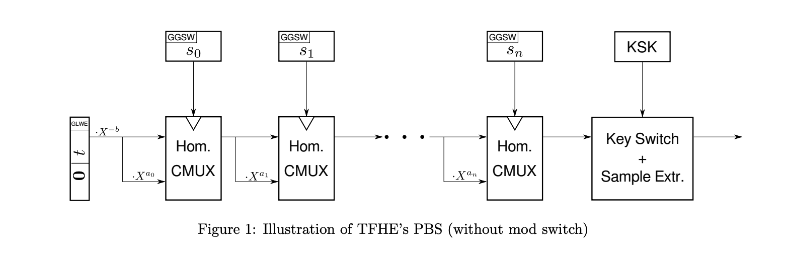 At the first part of PBS, one should compute X−(Δ⋅m+e)=X−b+⟨a,s⟩ (this holds trivially in Rq because the exponents are in mod 2N). So how can homomorphically compute this? Since b is public value, GLWE ciphertext of X−b is given first. Depending on the value of each si∈{0,1}, one can multiply the GLWE ciphertext of Xai or just skip multiplying. This is where CMux operation and bootstrapping key comes to play. Since bootstrapping key is the GGSW ciphertext of each si, it is given to CMux operation as selector, and two GLWE ciphertexts, each of encrypting X−b+a0 and X−b. Then this CMux operation will compute X−b+a0s0. Applying CMux operation n times, one can compute X−b+∑i=0n−1aisi.
