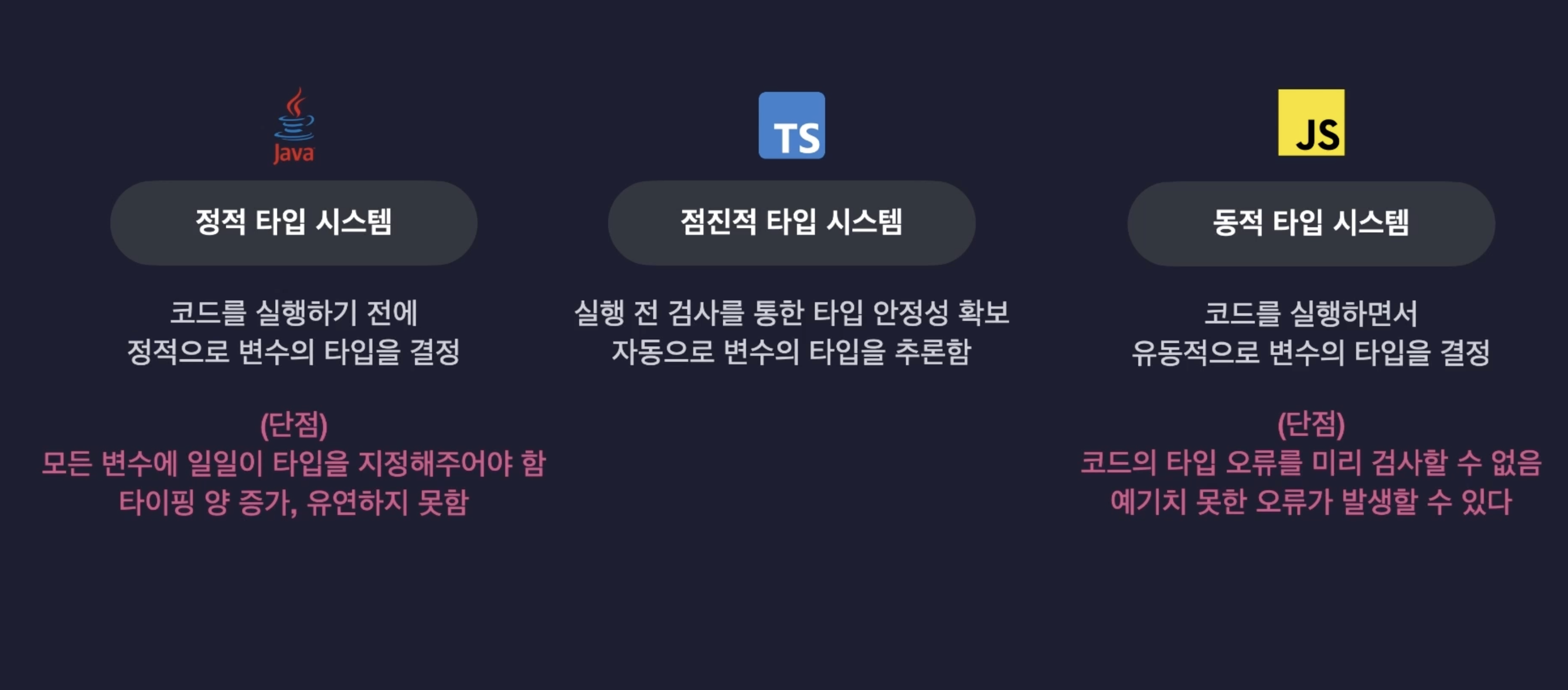 자바스크립트는 유연한 문법과 자유롭다는 특징이 있지만, 그렇기 때문에 버그 발생 가능성이 아주 높아 프로그램의 전체적인 안정성이 떨어진다.