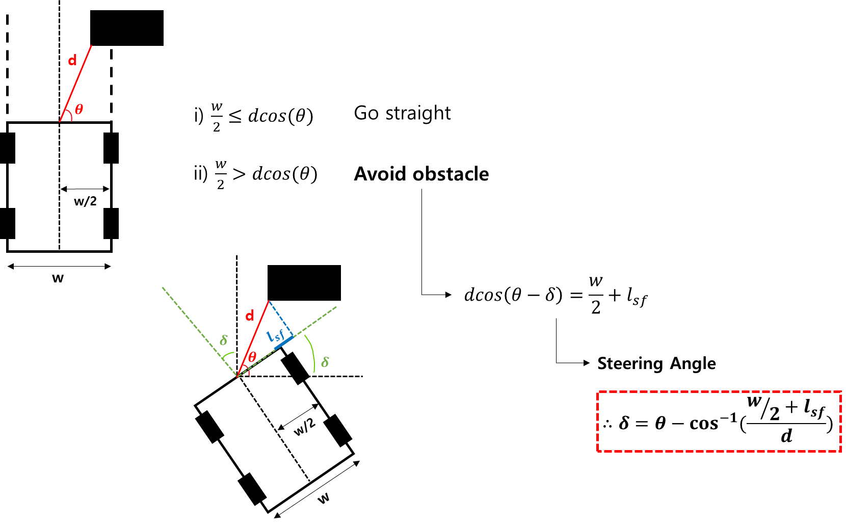 차체의 제원 w를 알 수 있고, 안전거리 l_sf를 임의로 설정하면 적절한 steering angle을 계산할 수 있다.