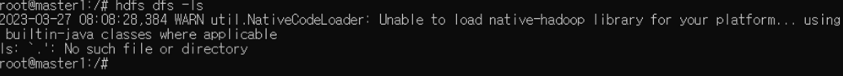 경고 없이 실행이 된다. 그러나 아직 hdfs dfs -ls