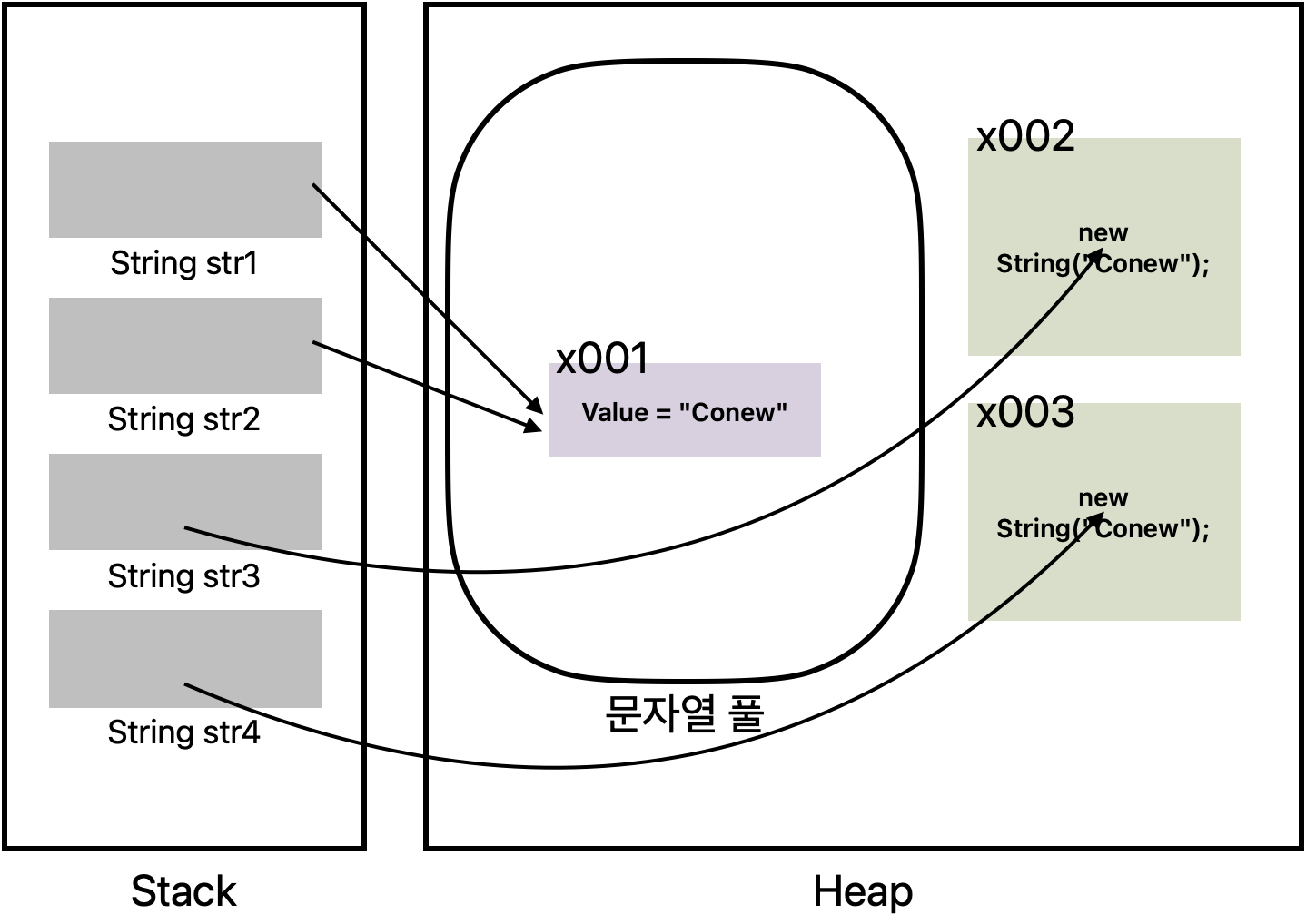 모두 문자열 풀에서 "Conew"