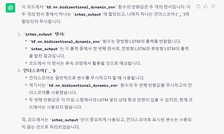 가장 이해하기 어려웠던 부분이었다. outputs, 옆에 붙은 _의 존재가 이해되지 않았다. 이 부분은 알고 보니 반환값이 2개인 tf.nn.bidirectional_dynamic_rnn 함수의 특성 때문이었다. 이 코드에서는 tf.nn.bidirectional_dynamic_rnn가 반환하는 두 개의 텐서 중 첫 번째만 사용하기로 하고 두 번째 텐서는 무시하기 위해 _ 를 사용했다.