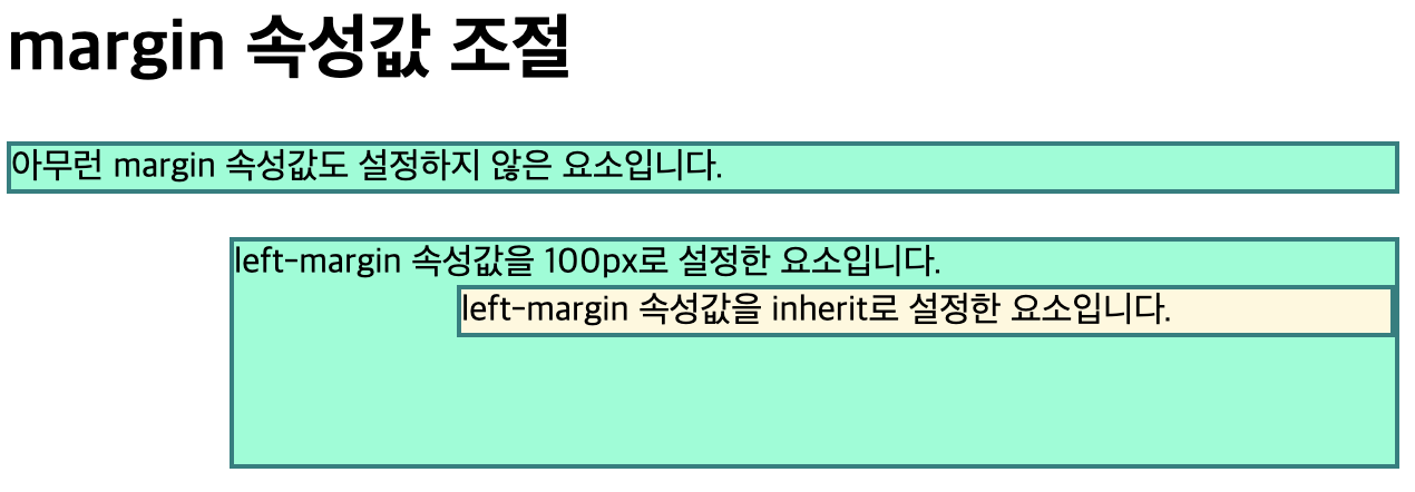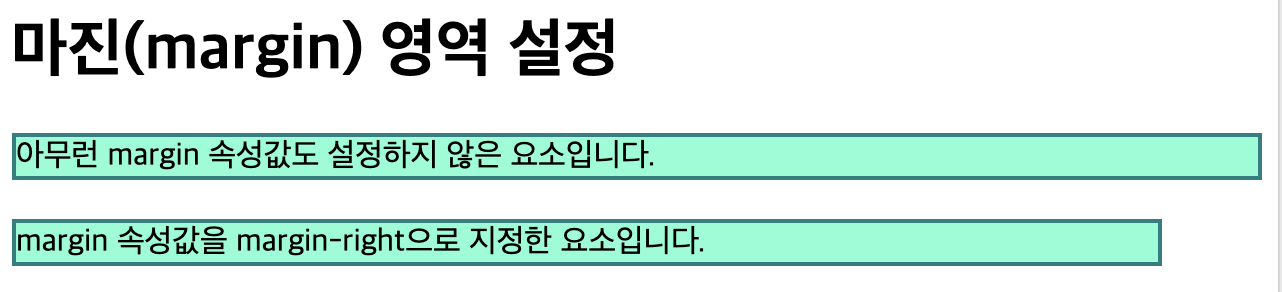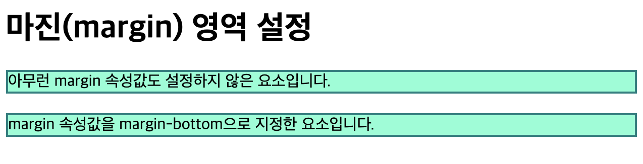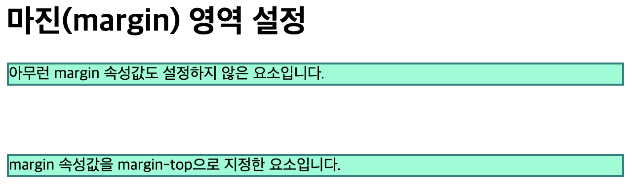 margin 속성은 테두리(border)와 이웃하는 요소 사이의 간격인 마진 영역의 크기를 설정한다. 이러한 마진 영역은 패딩 영역과는 달리 background-color 속성으로 설정하는 배경색의 영향을 받지 않는다.