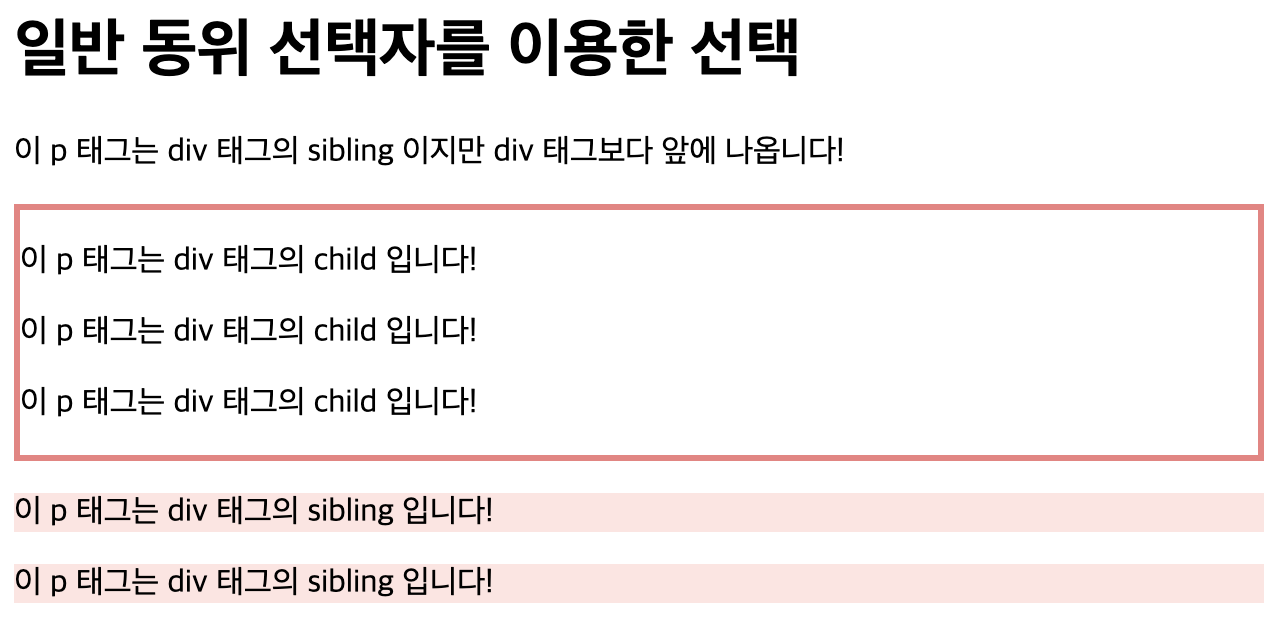 동위 선택자는 동위 관계에 있는 요소 중에서 해당 요소보다 뒤에 존재하는 특정 타입의 요소를 모두 선택한다.