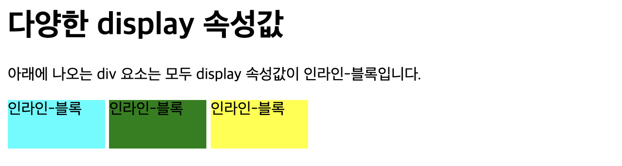 '줄 바꿈이 일어나지 않는 동시에 block 박스의 특징을 가지는 박스'로, display 속성값이 인라인-블록(inline-block)으로 설정된 요소는 해당 요소 자체는 인라인(inline) 요소처럼 동작한다. 하지만 해당 요소 내부에서는 블록(block) 요소처럼 동작한다.