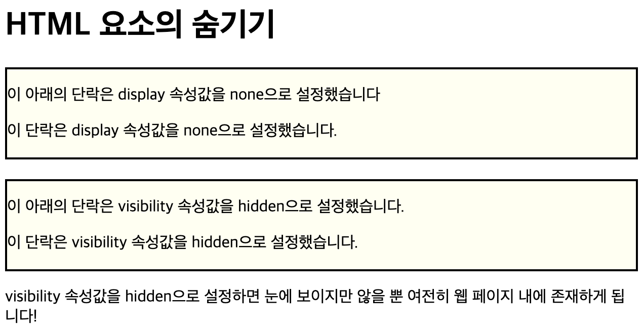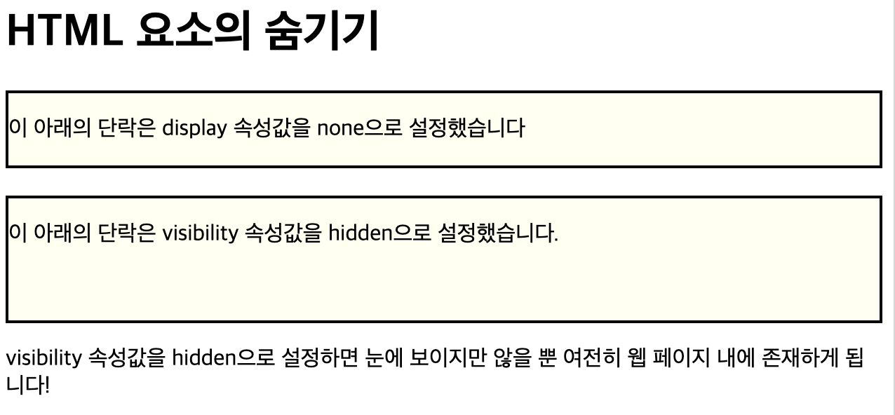 또한, visibility 속성값을 hidden으로 설정해도 HTML 요소를 숨길 수 있다.