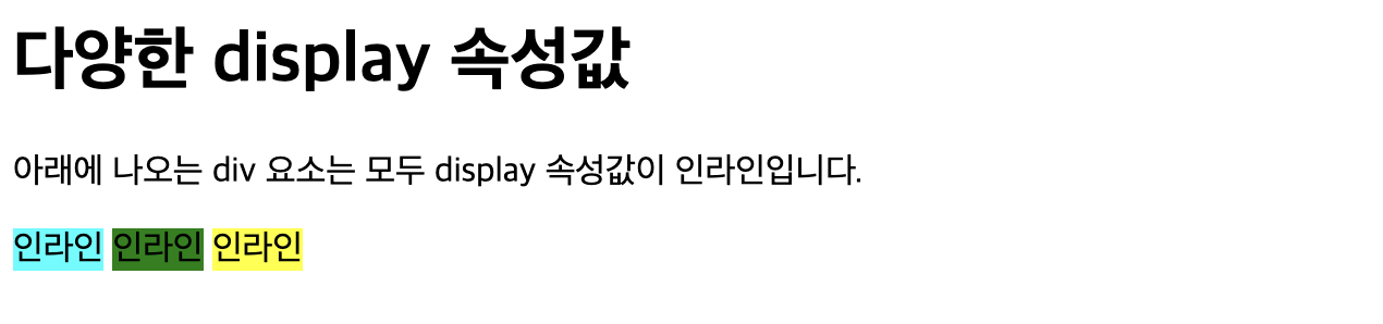 '줄 바꿈 없이 옆으로 붙는 박스'로, display 속성값이 인라인(inline)인 요소는 새로운 라인(line)에서 시작하지 않는다. 또한, 요소의 너비도 해당 라인 전체가 아닌 해당 HTML 요소의 내용(content)만큼만 차지한다.