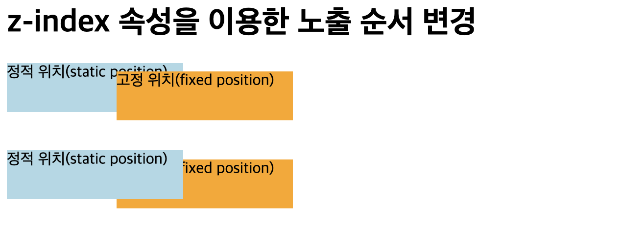 first position인 요소는 static position 요소보다 위에 있지만, last position 요소는 z-index: -1 속성이 있기 때문에 static position 요소보다 아래에 위치해 있다.