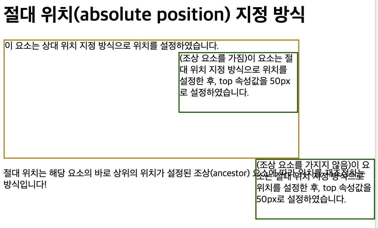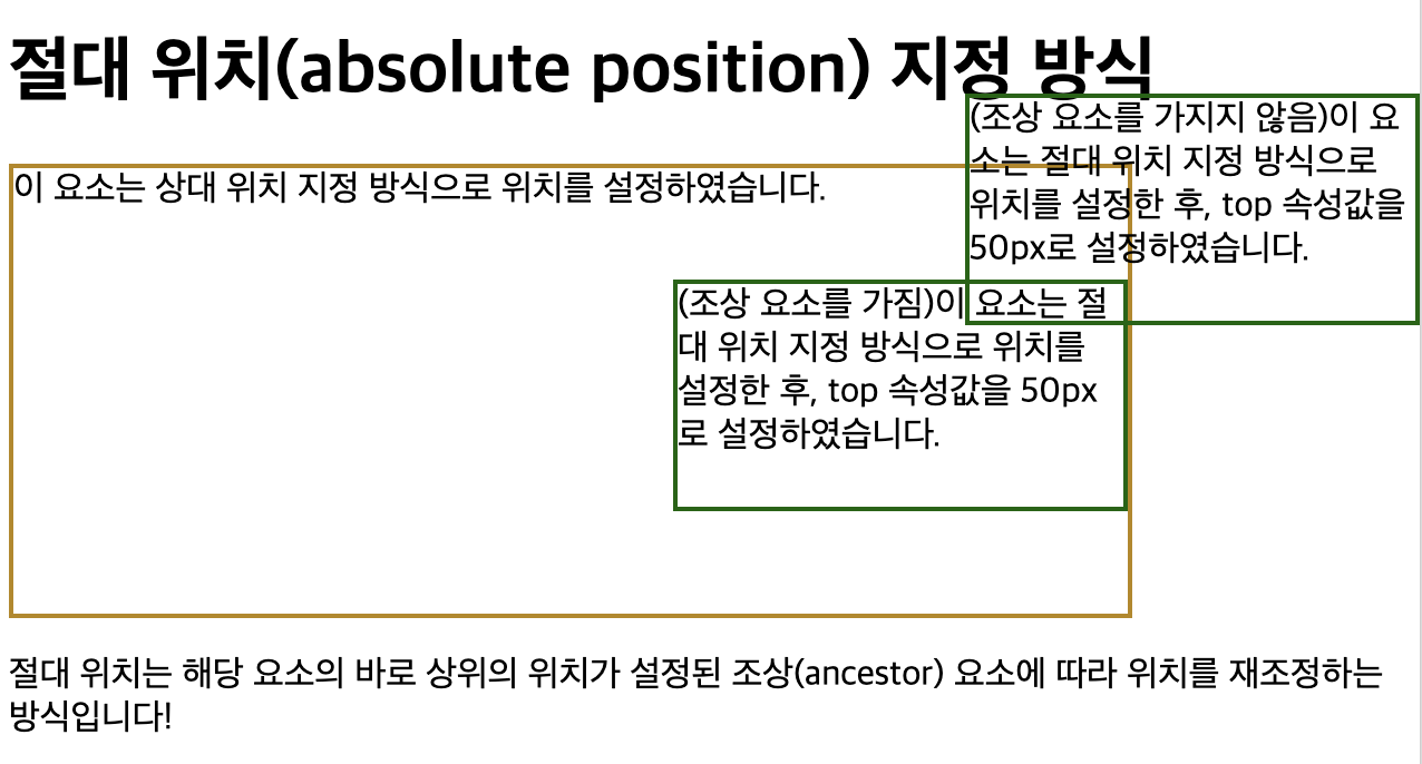 절대 위치(absolute position) 지정 방식은 고정 위치가 뷰포트를 기준으로 위치를 결정하는 것과 비슷하게 동작한다. 그러나 뷰포트(viewport)를 기준으로 하는 것이 아닌 위치가 설정된 조상(ancestor) 요소를 기준으로 위치를 설정하게 된다.