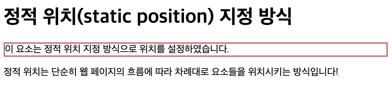 정적 위치(static position) 지정 방식은 단순히 웹 페이지의 흐름에 따라 차례대로 요소들을 위치시키는 방식이다.