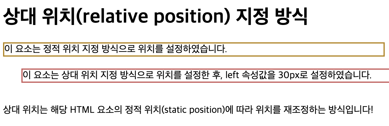 <div class="relative">이 요소는 상대 위치 지정 방식으로 위치를 설정하였습니다.