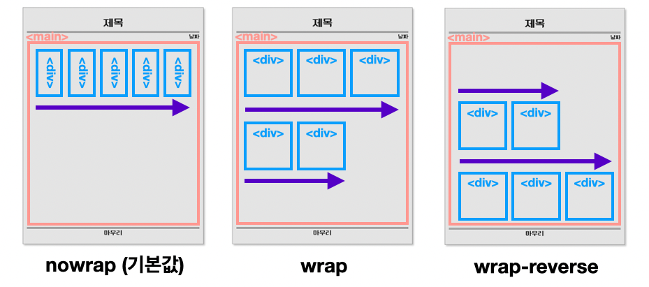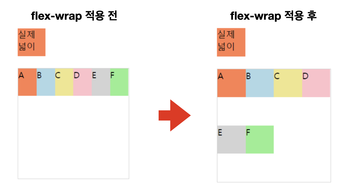 flex container(부모 요소)의 넓이보다 flex item(자식 요소)들의 전체 넓이가 더 크다면 나머지 flex container(부모 요소)의 넓이가 넘어가는 flex item(자식 요소)들부터는 다음줄로 줄바꿈 한다.