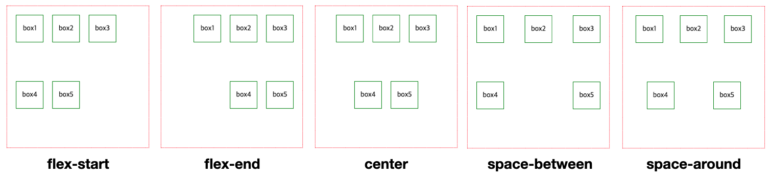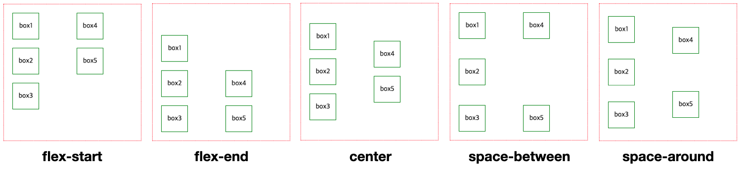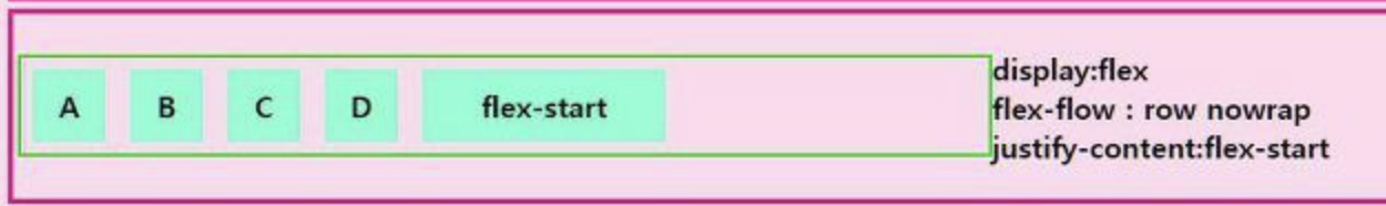 justify-content 속성은 flex item(자식 요소)들을 축의 수평(가로) 방향으로 좌우에 대해 어떻게 정렬할 것인지 정한다.display : flex와 함께 사용된다.flex item(자식 요소)들을 flex container(부모 요소)의 왼쪽으로 정렬한다.