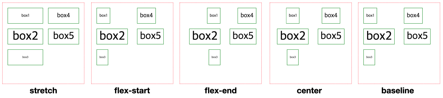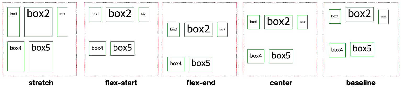 flex item(자식 요소)가 flex container(부모 요소)의 기준선(baseline)으로 정렬된다.flex item(자식 요소)들이 정렬된다.