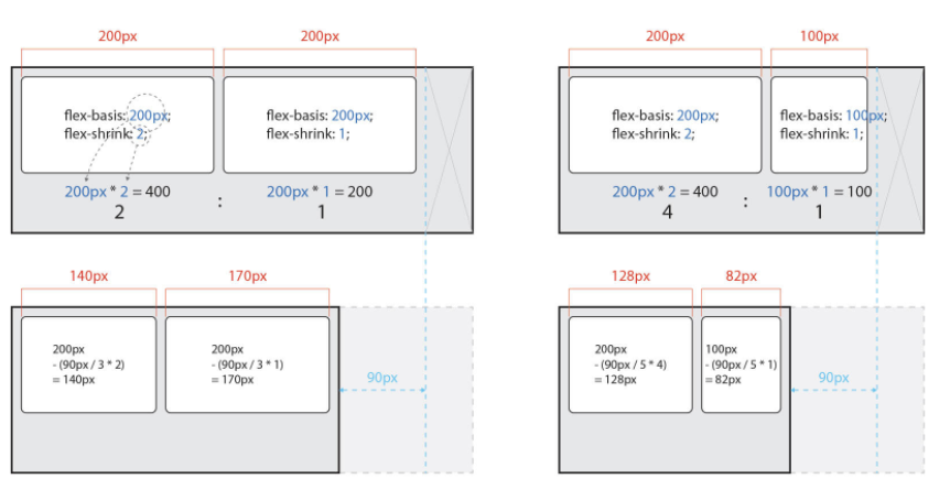shrink(수축 지수)는 grow와 반대로, 설정한 비율만큼 박스 크기가 작아진다(비율이 클수록 더 많이 줄어듬). 그러나 flex-grow 속성과 flex-shrink 속성을 함께 사용하는 일은 권장하지 않는다. 비율로 레이아웃을 지정할 경우 flex-grow 속성 또는 flex: <grow> 1 auto와 같이 grow 속성에 변화를 주는 방식을 권장한다. flex-shrink 속성은 width 나 이후 설명할 flex-basis 속성에 따른 비율이므로 실제 크기를 예측하기가 어렵기 때문이다. flex-grow 속성으로 비율을 변경하는 경우, flex-shrink 속성은 기본값인 1로 두어도 상관없다.