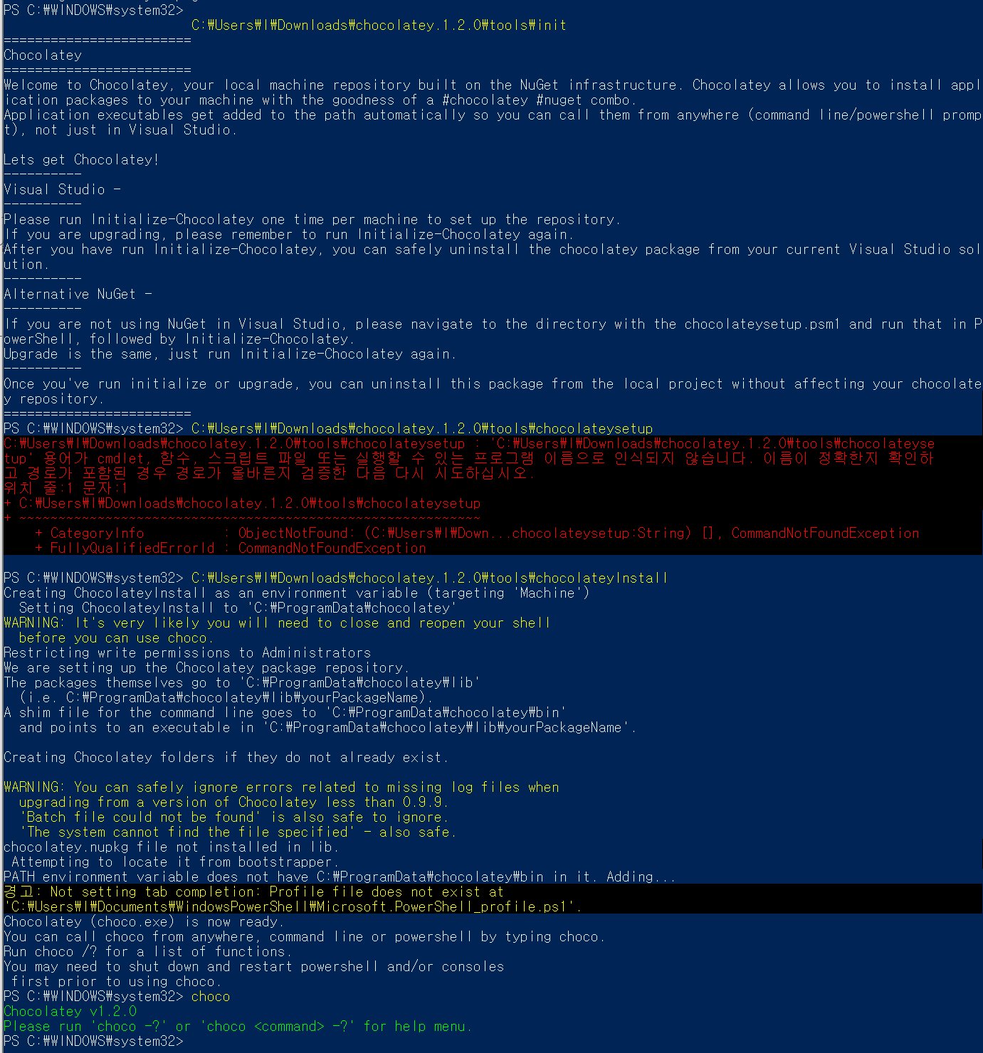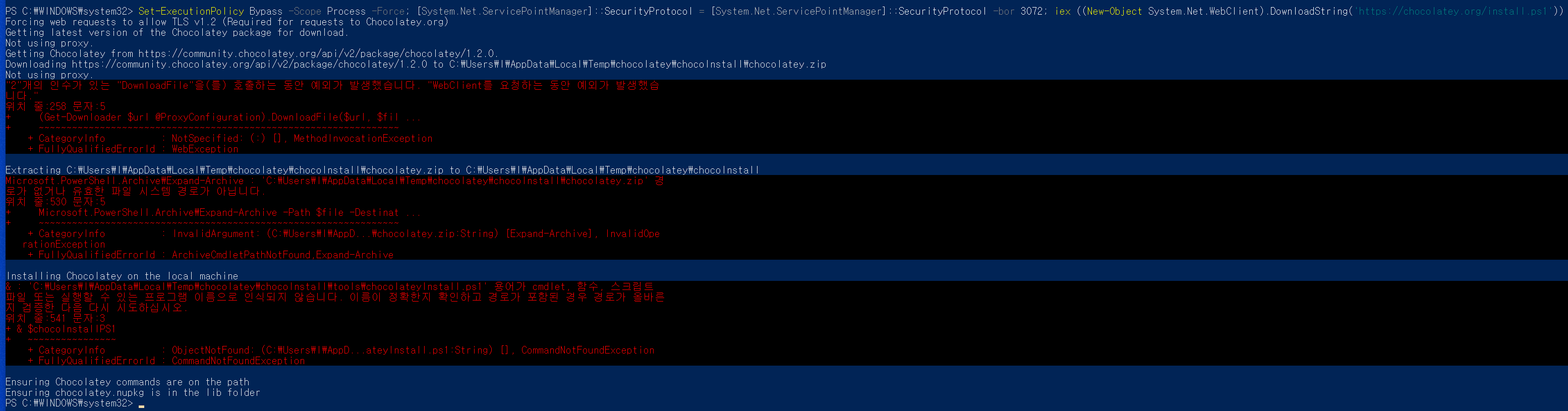 Chocolatey 설치 중 아래와 같이 에러 발생하면서 설치가 안됨