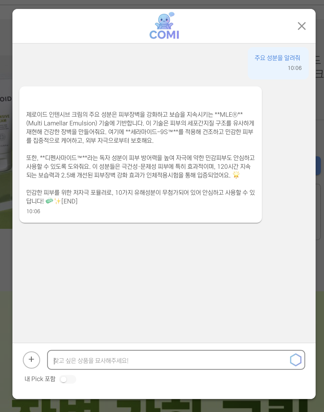 상세페이지에서 챗봇을 사용하면 해당 상품에 대한 자세한 정보를 확인할 수 있다.