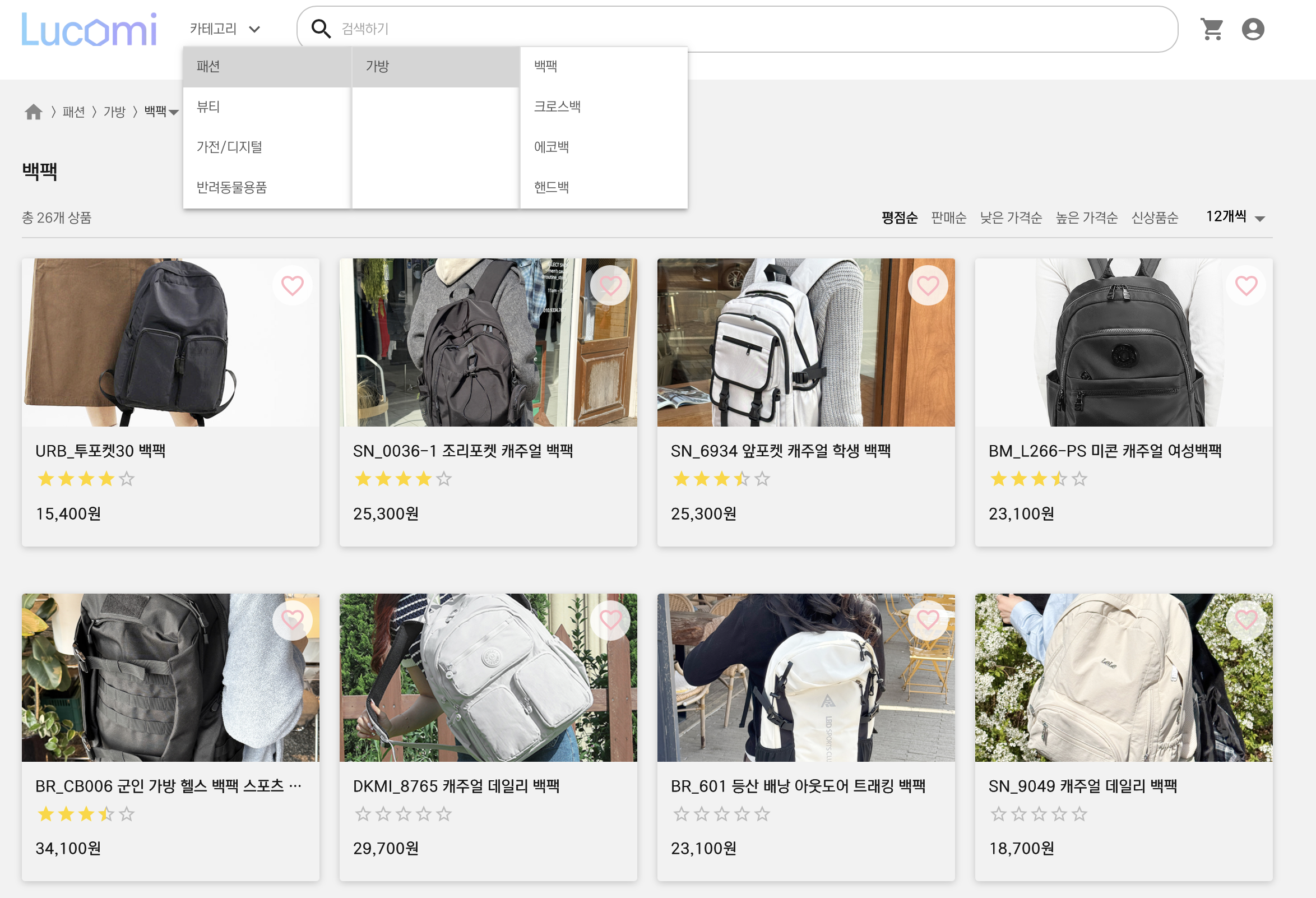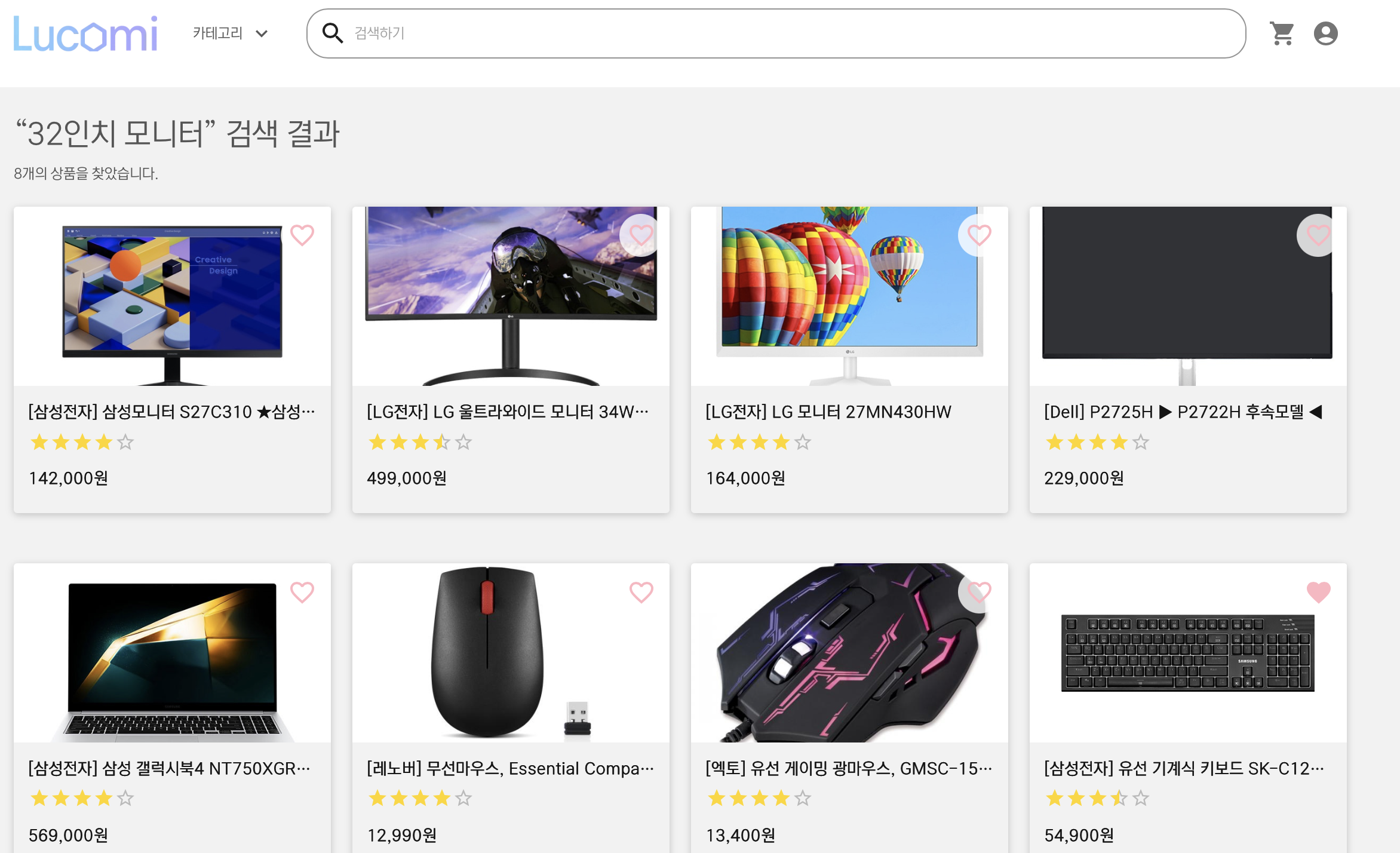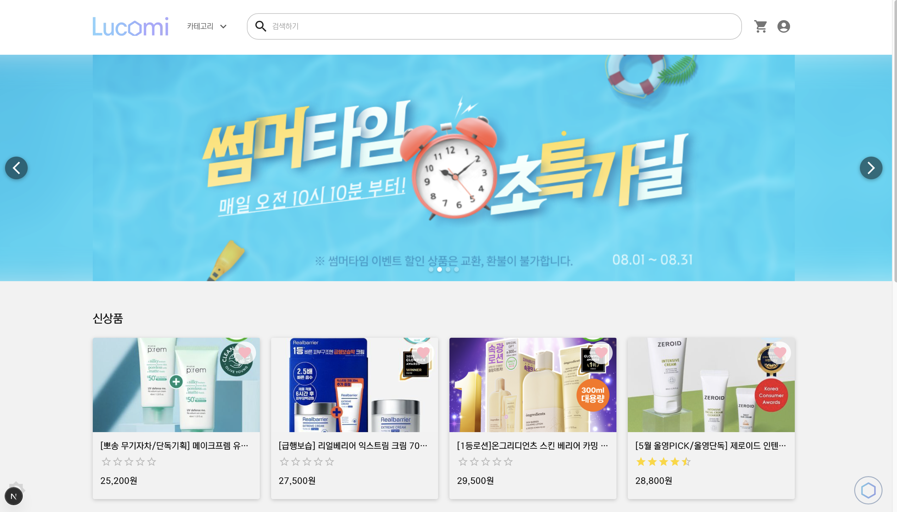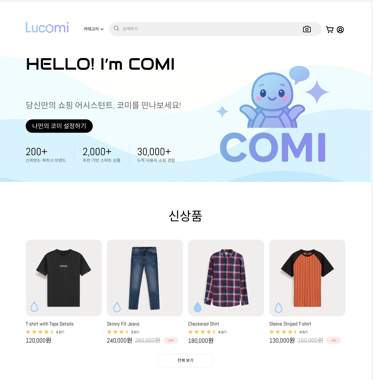 홈에서는 신상품과 베스트 상품을 4개씩 보여지며, 찜과 평균별점을 확인할 수 있다.