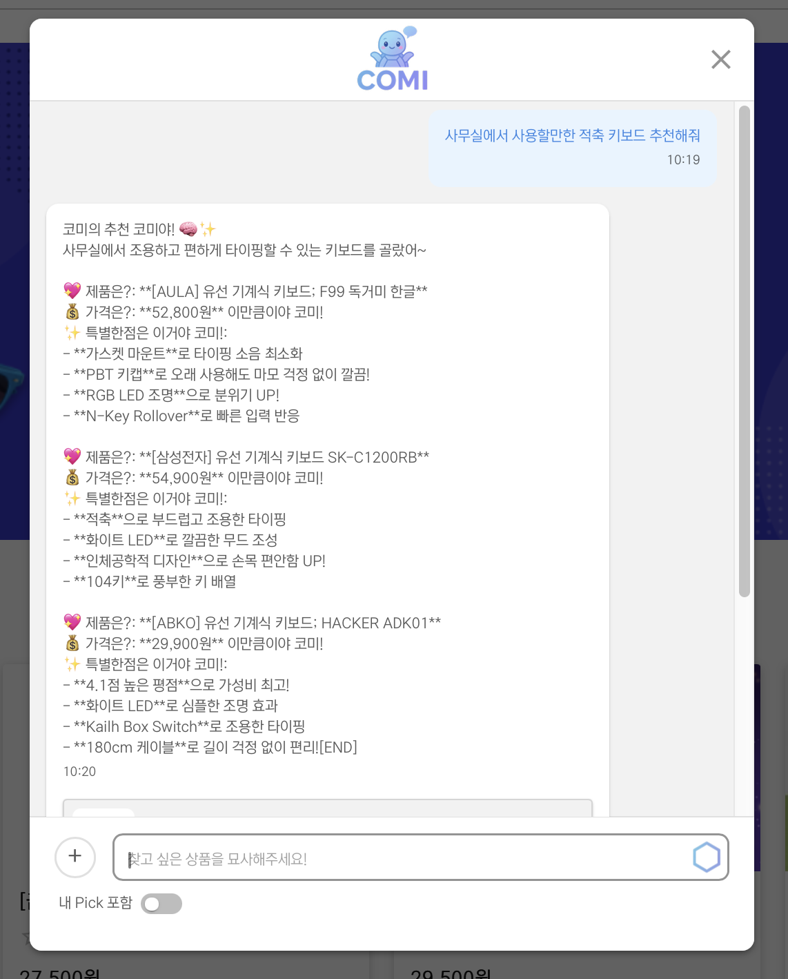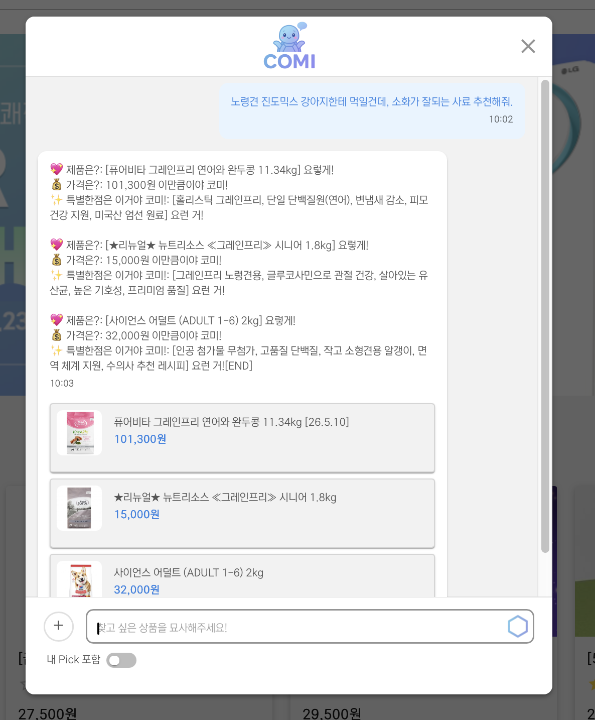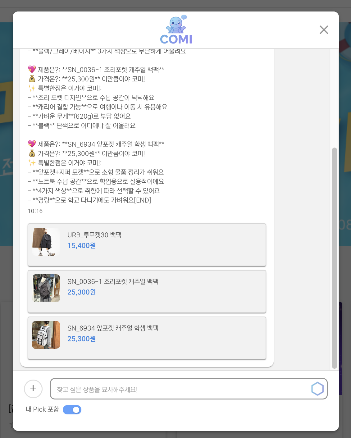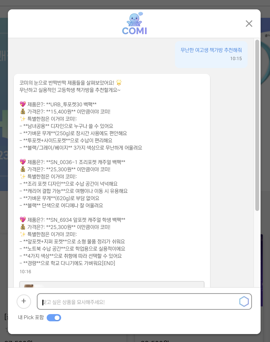 내 pick 포함은 내가 '찜'한 상품 안에서 제품을 추천한다.