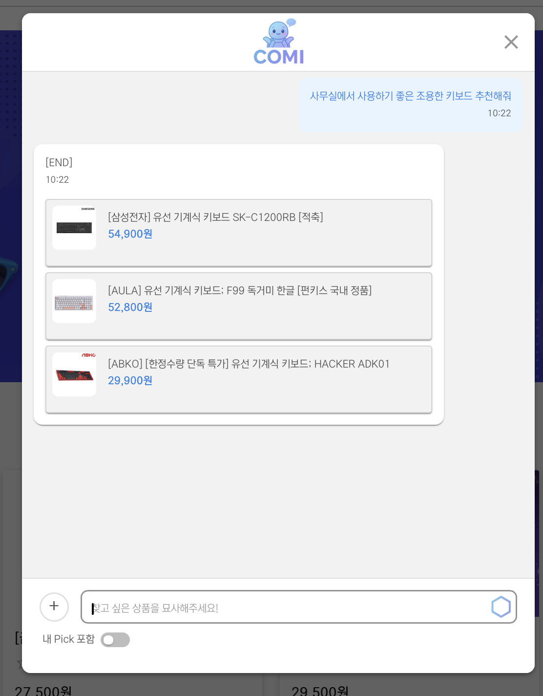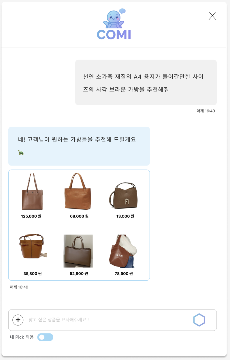 홈 화면에서 챗봇을 이용하면, 스토어에 등록된 상품 중 소비자에게 적합한 제품을 추천한다.